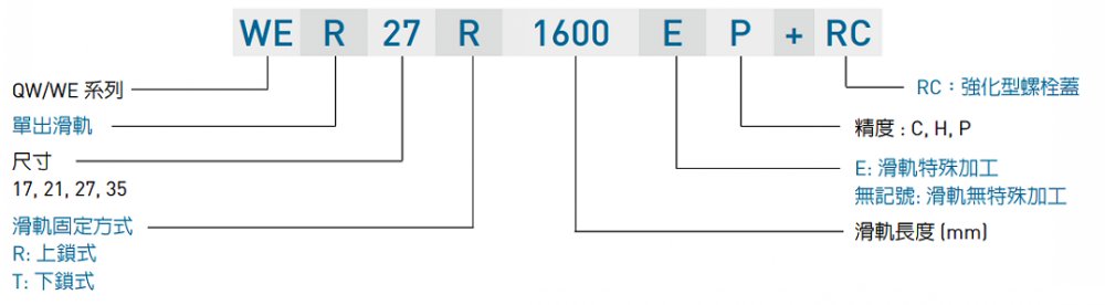 QW系列分为非互换性及互换性型两种直线导轨,两者规格尺寸相同,主要差异点在于互换性型之滑块、滑轨可单独互换使用,较便利,但其组合精度无法达到非互换性型之超精密级以上的精度,不过由于HIWIN互换性型之组合精度目前已达到一定的水平,对不需配对安装直线导轨的客户而言,是一项便利的选择。直线导轨的产品规格型号主要标明直线导轨尺寸、型式、精度等级、预压等规格要求,以利订货时双方对产品的确认。QW系列与WE系列滑轨共享,客户无需为了选用静音式产品而重新设计安装尺寸,如此更加提升了QW系列的应用性与可互换性。